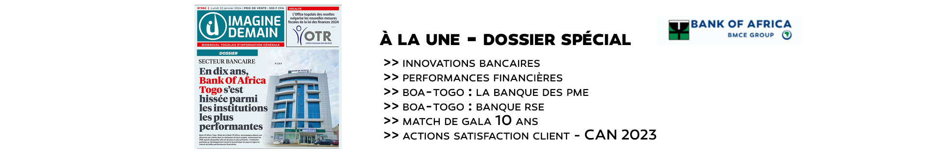 Un dossier spécial qui retrace le parcours sur 10 ans de la banque, les grandes réalisations, les performances financières, l’ensemble des innovations bancaires, l’impact des actions RSE, la stratégie pour favoriser le développement des PME et aussi les grandes actions pour améliorer la Gestion de la Relation Client.